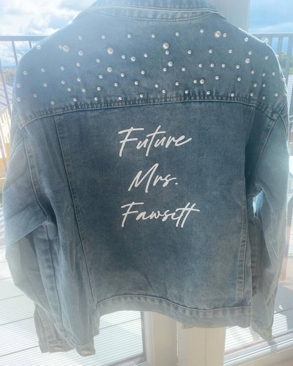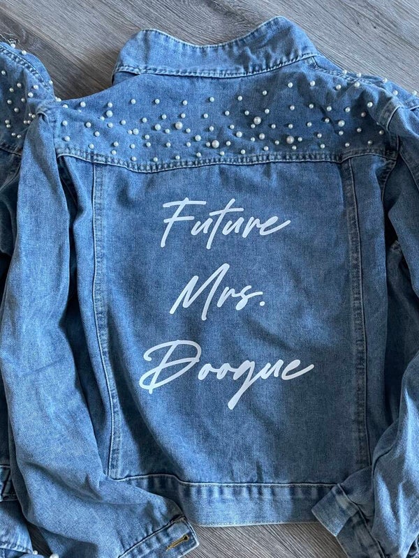 Add a touch of sparkle and personality to your wedding celebrations with our stunning Pearl Personalised Denim Jacket. This handcrafted denim piece is the perfect mix of casual cool and bridal glam, featuring delicate pearl embellishments and your custom wording across the back – whether it's Future Mrs. [Your Name], Bride, or a fun wedding hashtag!