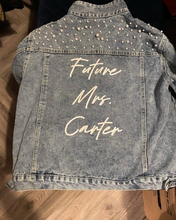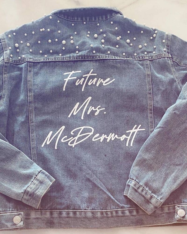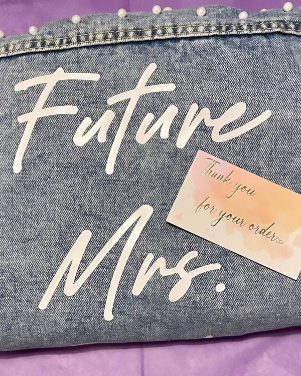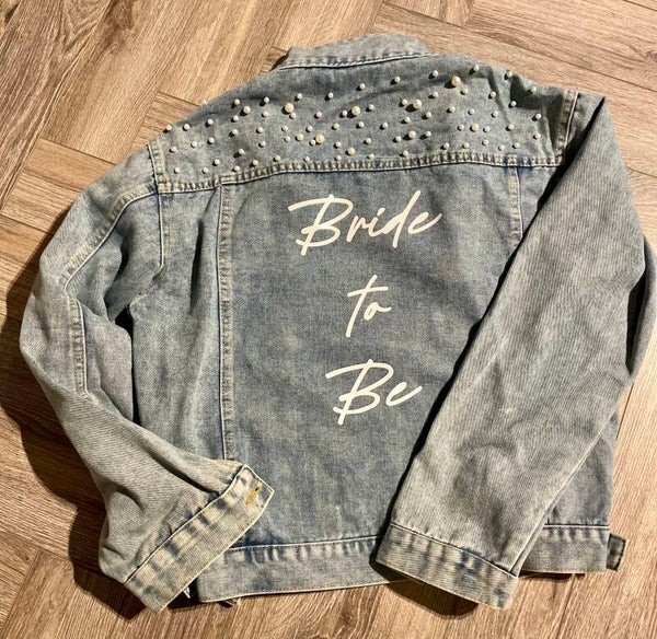 Add a touch of sparkle and personality to your wedding celebrations with our stunning Pearl Personalised Denim Jacket. This handcrafted denim piece is the perfect mix of casual cool and bridal glam, featuring delicate pearl embellishments and your custom wording across the back – whether it's Future Mrs. [Your Name], Bride, or a fun wedding hashtag!