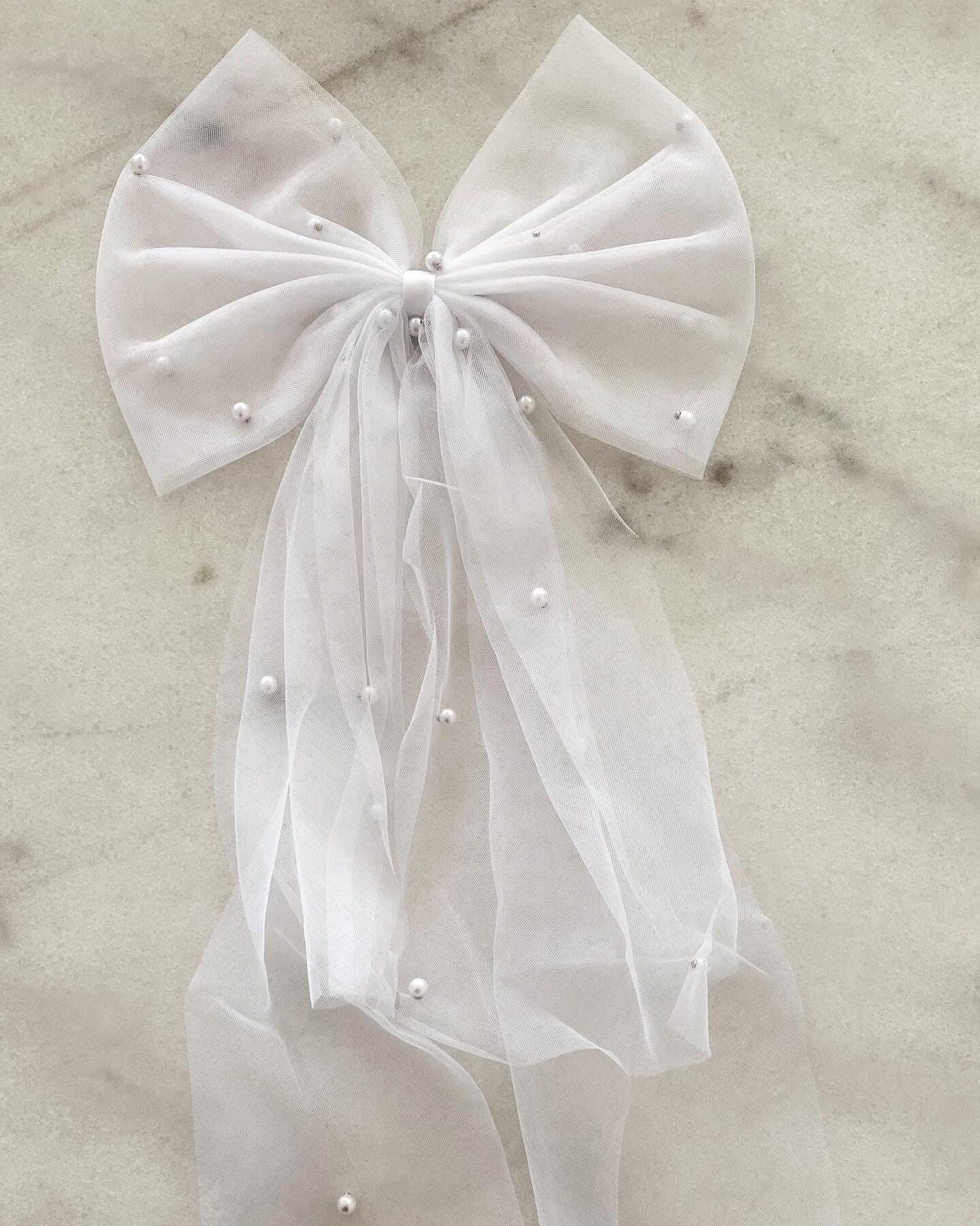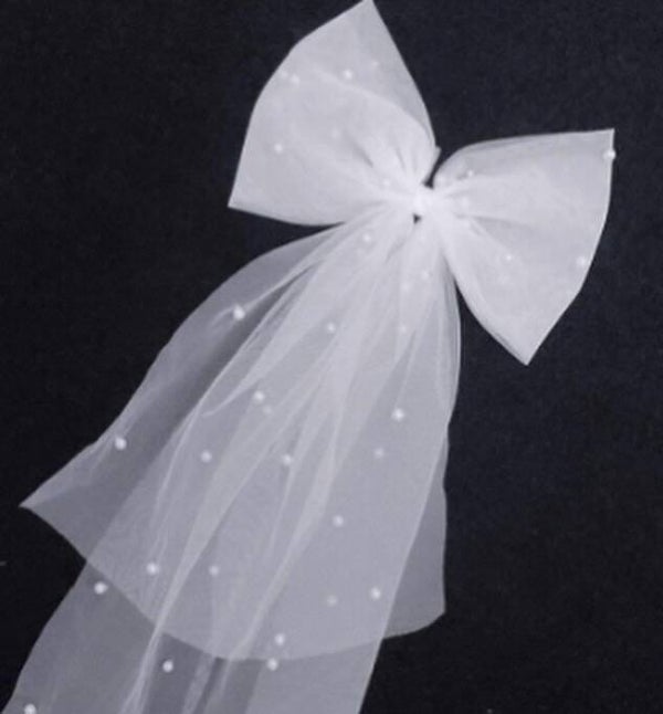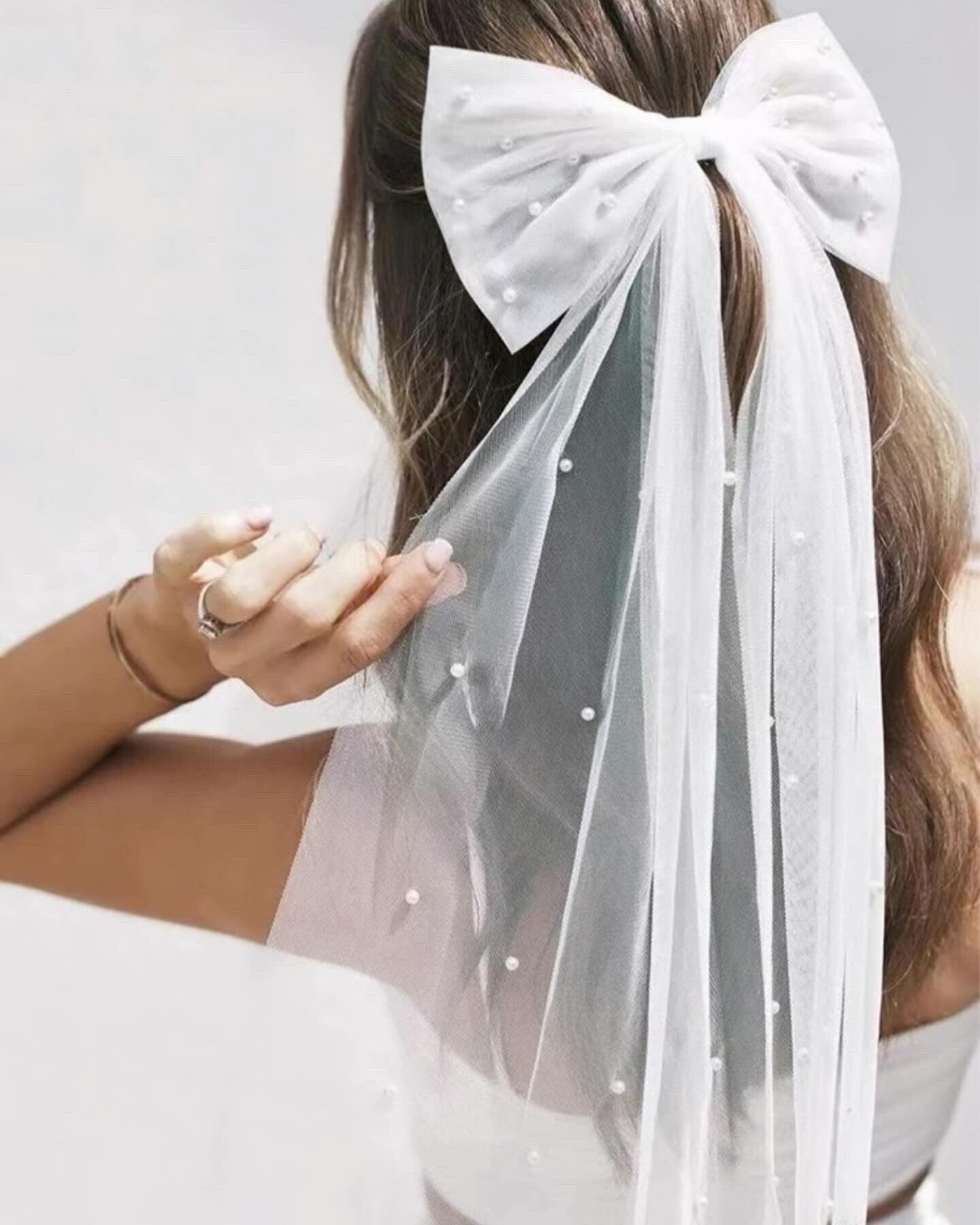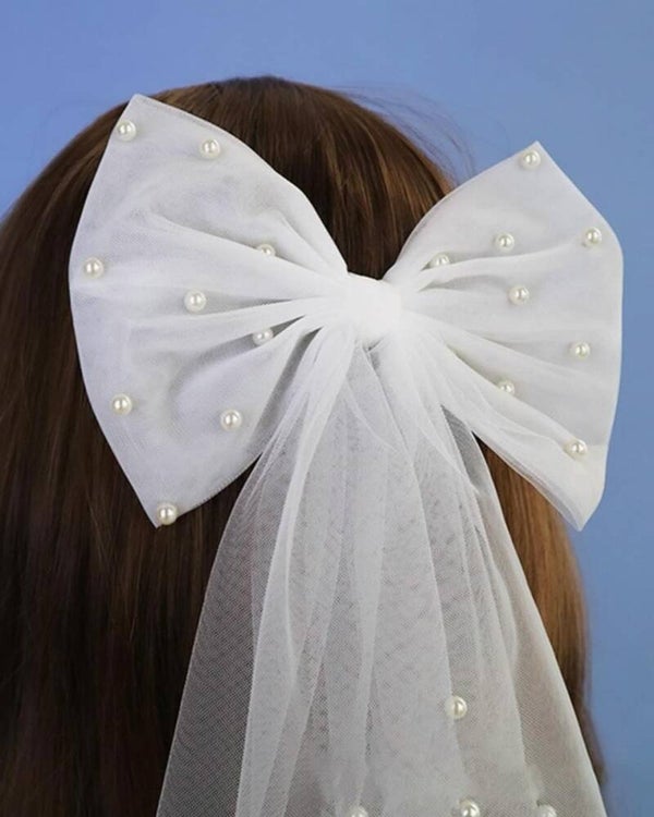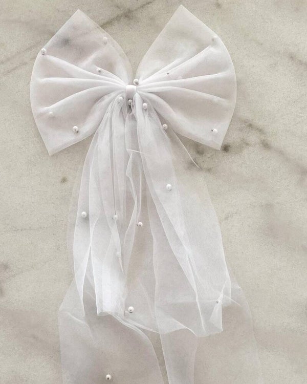 Add a touch of timeless elegance to your bridal look with this exquisite white bow hair clip, delicately embellished with luminous pearls. Crafted from soft tulle, the bow features a graceful silhouette that complements both classic and modern hairstyles.