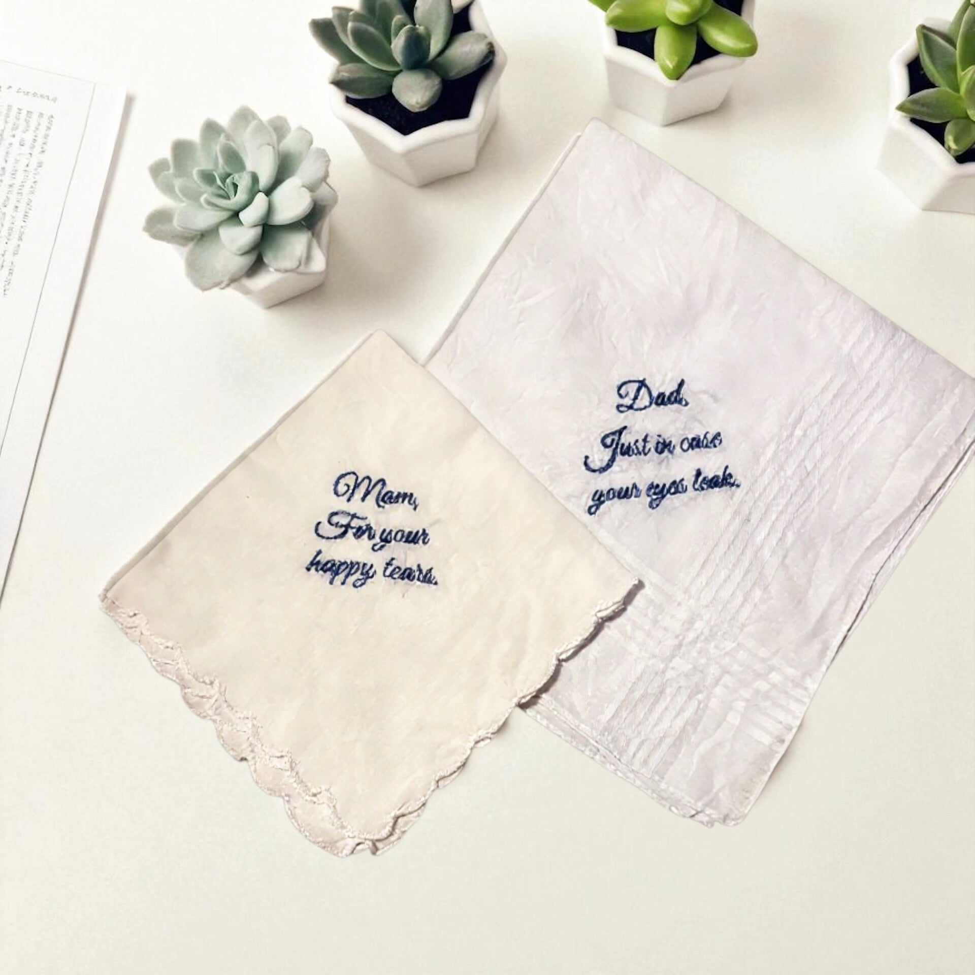 A timeless keepsake for your special day. Our beautifully embroidered handkerchiefs make the perfect gift for brides, grooms, parents, or loved ones — a delicate way to wipe away happy tears. Each piece is custom-made with your choice of name, date, or heartfelt message, creating a treasured memento to cherish forever.