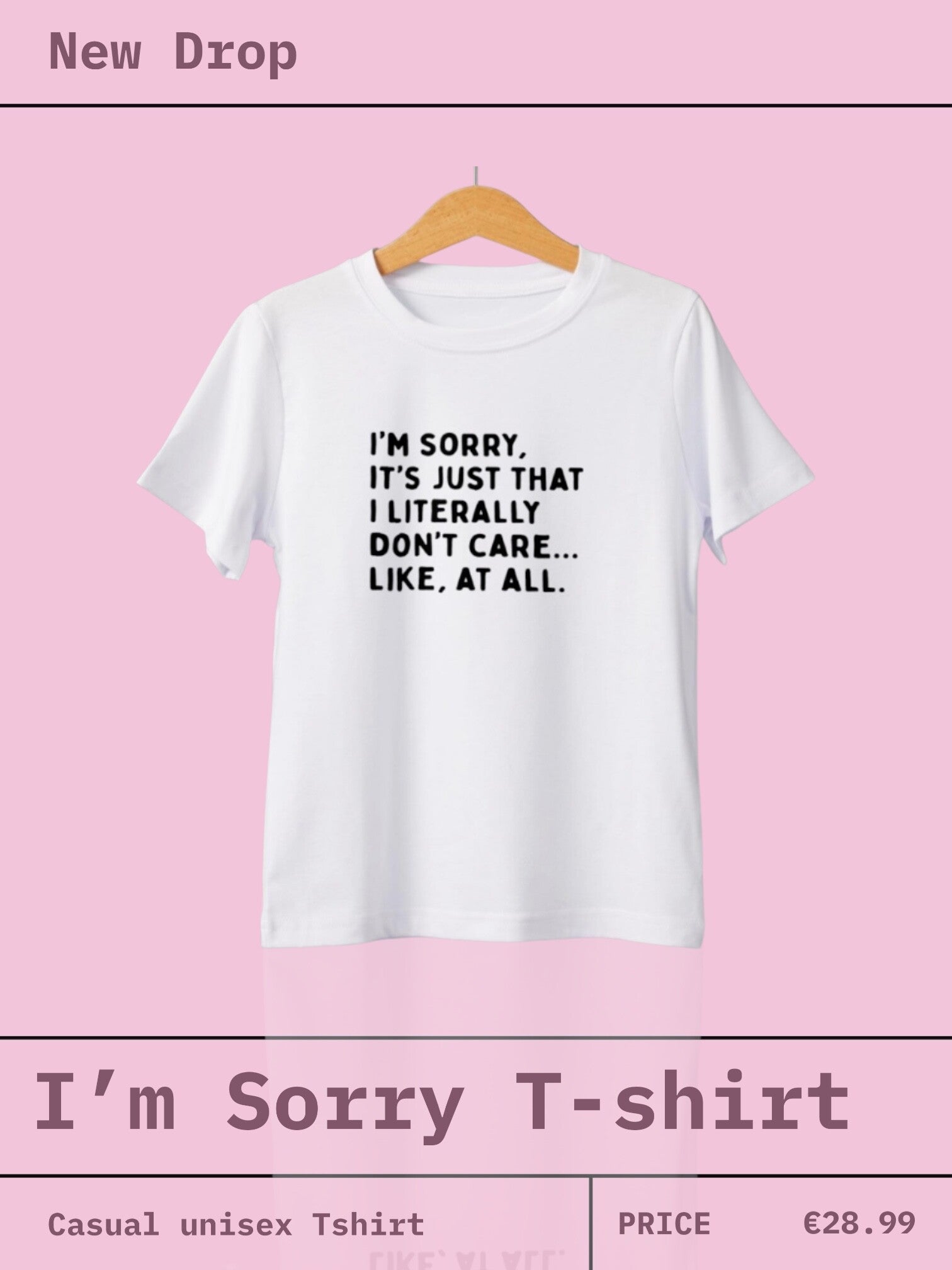 Make a statement without saying a word. The “I’m Sorry I Literally Don’t Care” T-Shirt is perfect for those who embrace sarcasm and unapologetic style. Made from soft, breathable fabric with a comfortable unisex fit, this funny graphic tee pairs effortlessly with jeans, joggers, or layered streetwear looks. Ideal for casual wear, gifting, or anyone who loves bold humor and attitude.