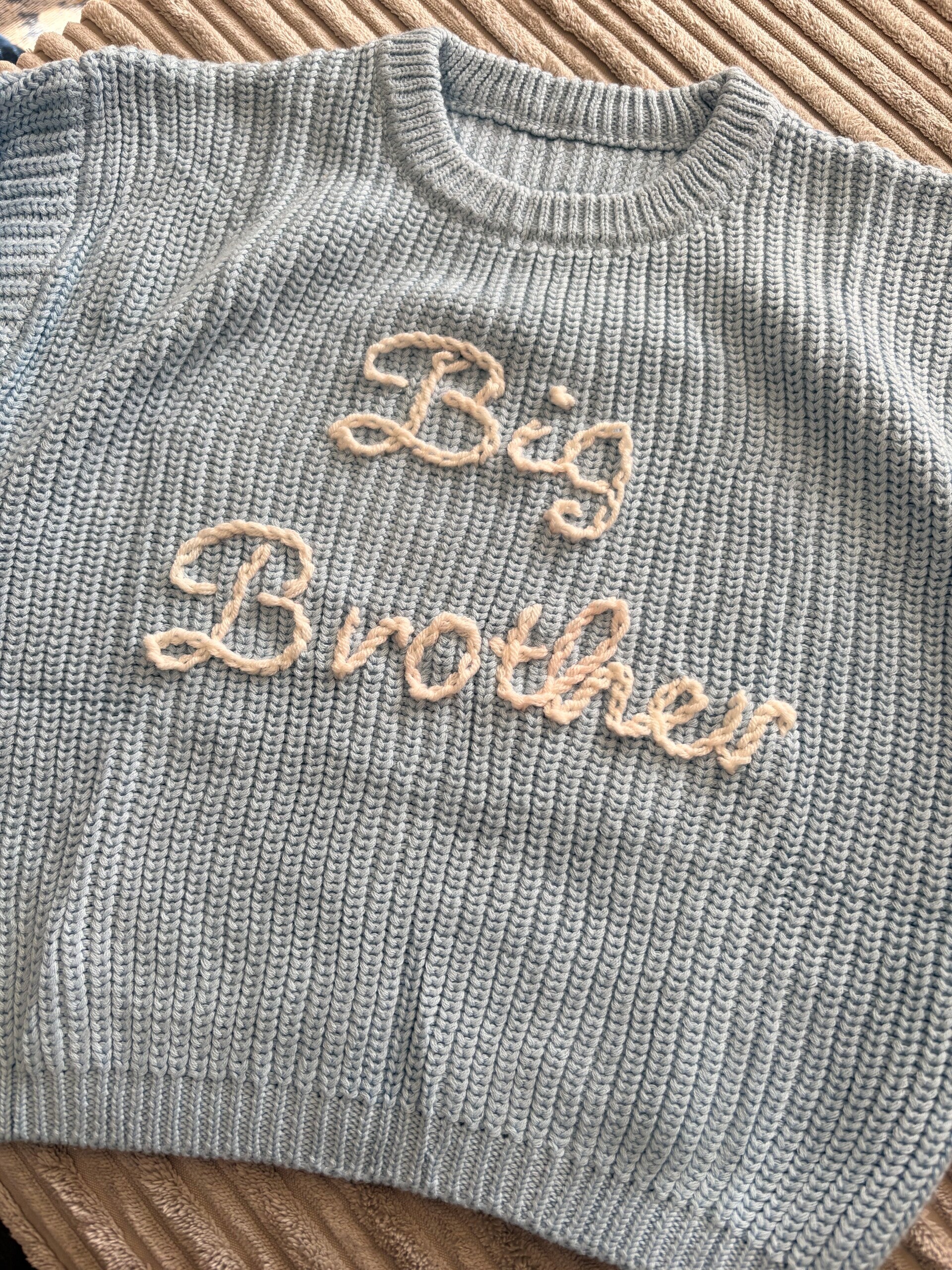 Celebrate your growing family with our beautifully hand embroidered baby announcement jumpers, specially designed for proud big brothers and big sisters.